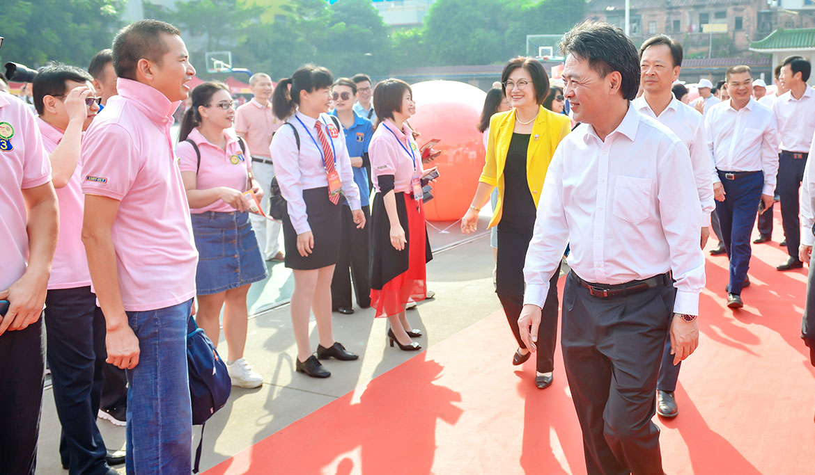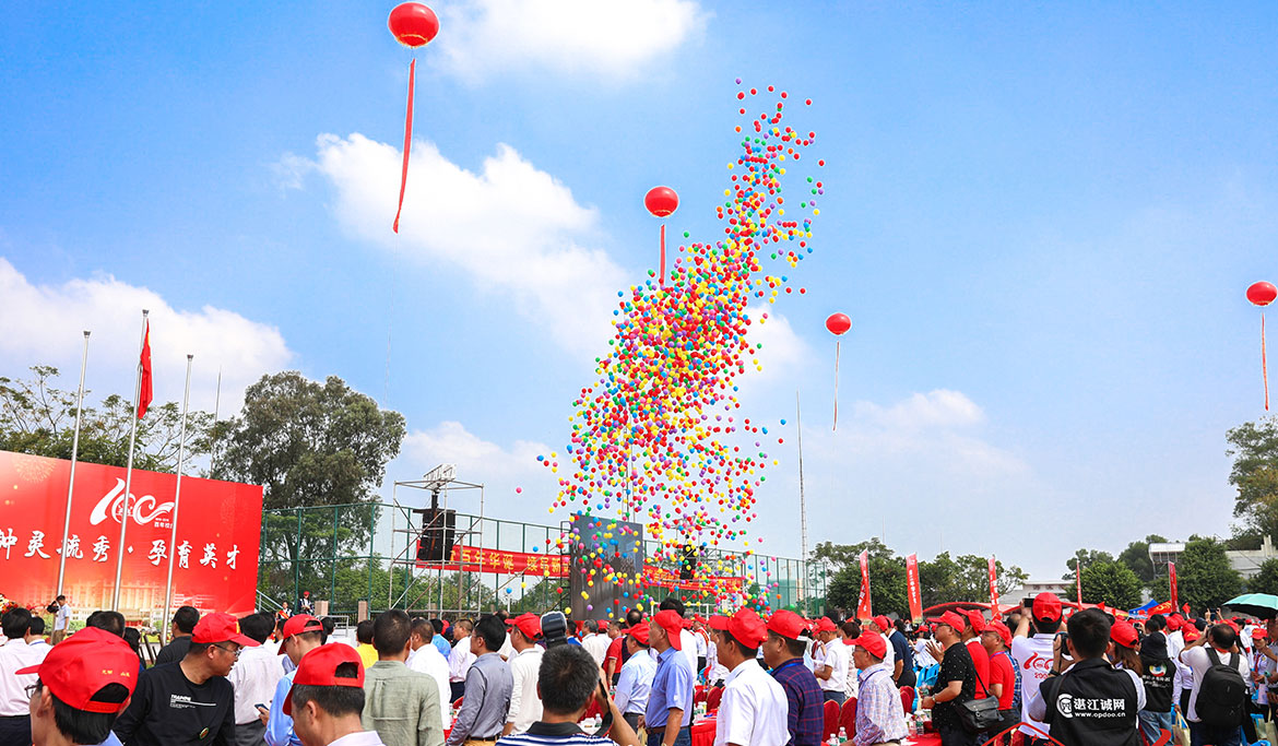 慶祝大會開始,省工業(yè)和信息化廳廳長涂高坤,湛江市副市長崔青,我市市委書記林海武,市委副書記、市長龐曉冬,市人大常委會黨組書記、主任李世東,市政協(xié)主席吳永光等市四套班子領(lǐng)導以及省內(nèi)兄弟學校,市直相關(guān)單位、各鎮(zhèn)(街),市總商會、各地商會、協(xié)會、香港同鄉(xiāng)會的領(lǐng)導及各屆校友代表,社會各界熱心人士、離退休校長、老師代表、在校師生等近萬人參加盛會。