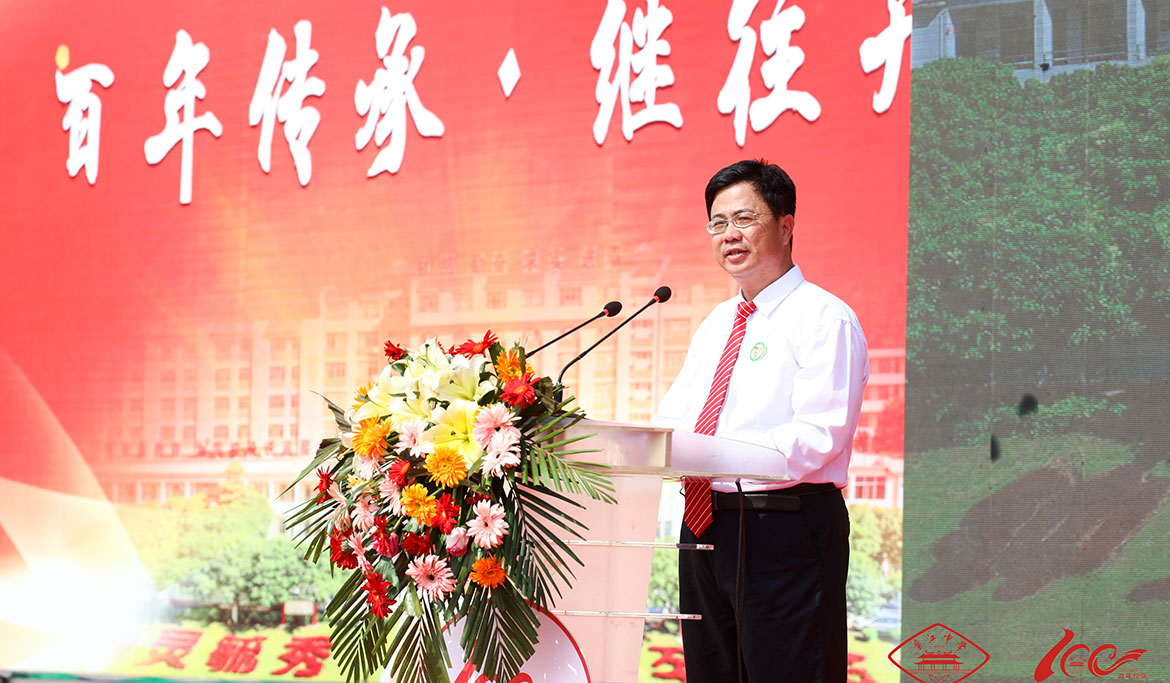校友、省工業(yè)和信息化廳廳長涂高坤宣讀教育廳發(fā)給廉江中學百年校慶的賀信