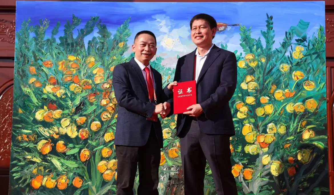 在開幕式上,周昌新還將“重彩繪橙園 文化興鄉(xiāng)村”廉江紅橙園現(xiàn)場創(chuàng)作的作品《廉江紅》,捐贈給廉江市博物館收藏,柯俊代表廉江市政府接受捐贈,并為周昌新頒發(fā)捐贈證書。
