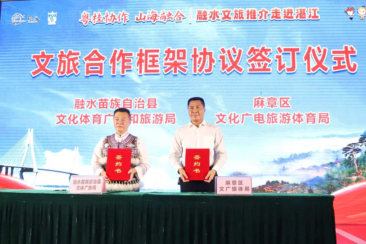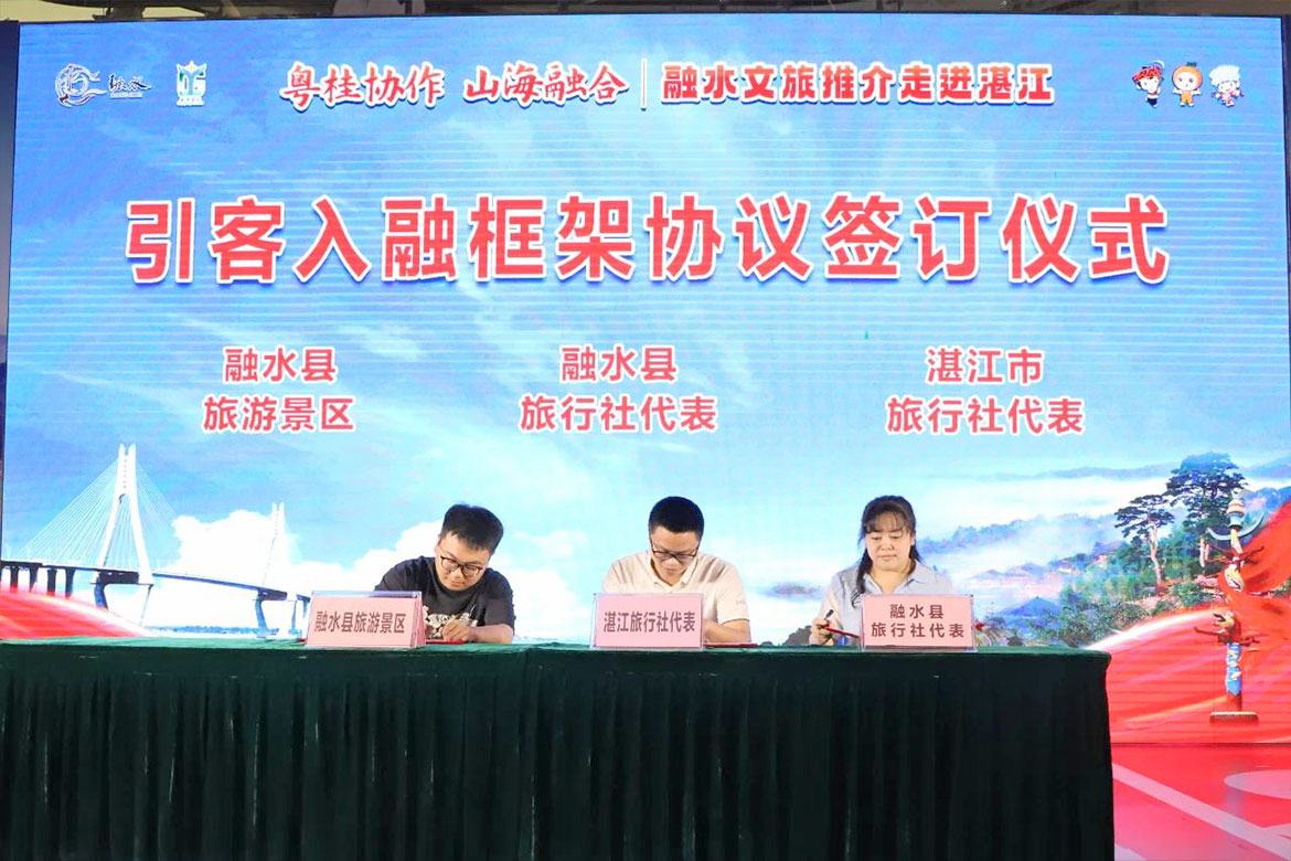 活動(dòng)現(xiàn)場,縣文體廣旅局分別與霞山區(qū)文旅體局、坡頭區(qū)文廣旅體局、麻章區(qū)文廣旅體局簽訂文旅合作框架協(xié)議,融水旅游景區(qū)和旅行社代表與湛江市旅行社代表上臺(tái)簽訂引客入融框架協(xié)議。未來兩地將攜手推動(dòng)旅游發(fā)展,通過游客互送的方式,讓更多湛江市民走進(jìn)融水,領(lǐng)略苗鄉(xiāng)的自然風(fēng)光與民族風(fēng)情。