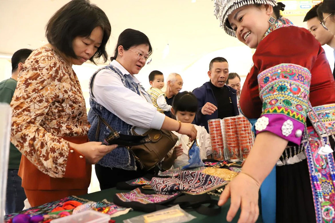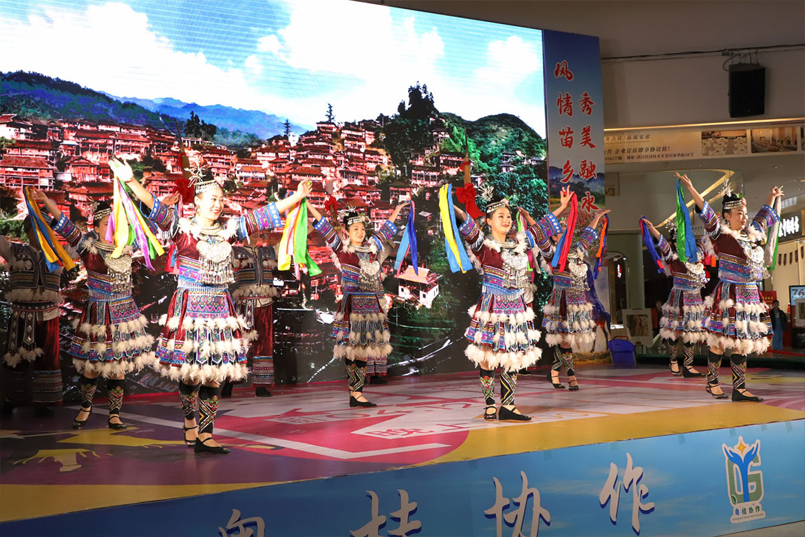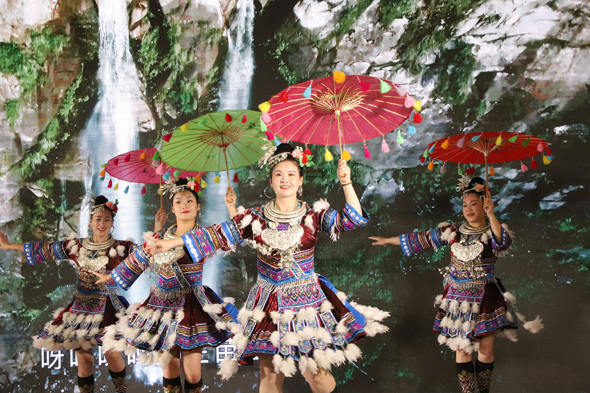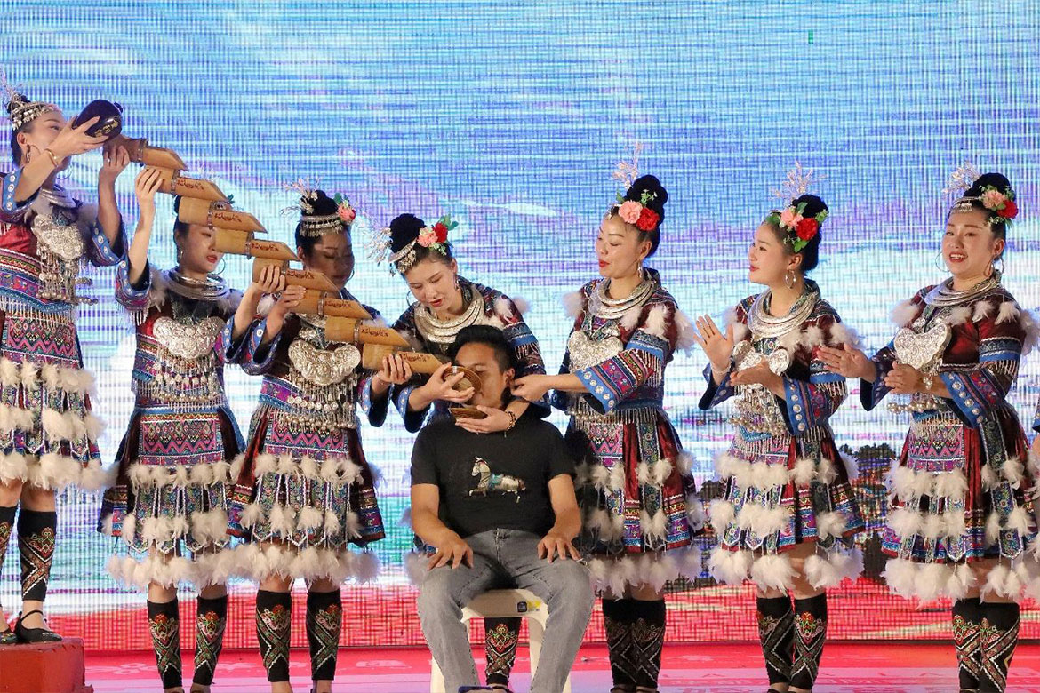 除了融水特色農(nóng)產(chǎn)品、文創(chuàng)產(chǎn)品,到油茶、臘肉、泡椒等地道的農(nóng)特產(chǎn)品展銷外,蘆笙演奏、苗族舞蹈等節(jié)目也在這里輪番上演。演員們還手持酒杯,為前來參加活動(dòng)的湛江市民敬上滿杯香甜的苗家酒,獨(dú)特的表演形式和互動(dòng)模式,不僅展現(xiàn)了融水獨(dú)特的民族文化魅力,更讓現(xiàn)場觀眾沉浸式體驗(yàn)到了苗家最高敬酒禮儀“高山流水”。